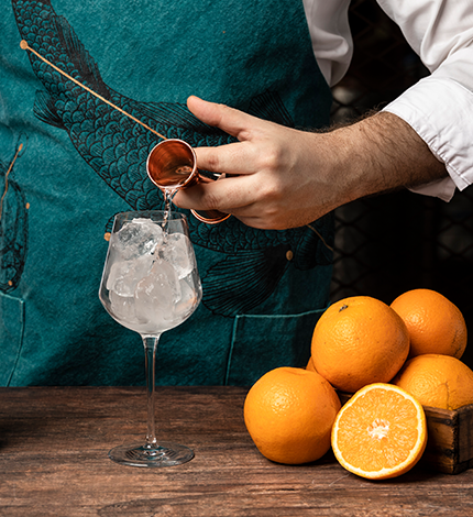 Em uma taça GT , coloque todos os ingredientes menos a tônica e mexa bem. Acrescente a tônica e mexa novamente. Decore com uma rodela de 2 meia lua de laranja. Sirva imediatamente sem canudo.